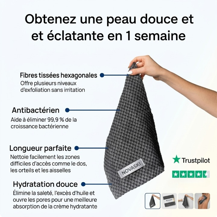 Fini les gants qui accumulent les bactéries et les gommages inefficaces. Novaski exfolie en profondeur, protège votre peau et sèche en 15 minutes — pour une peau nette, douce et saine à chaque douche.